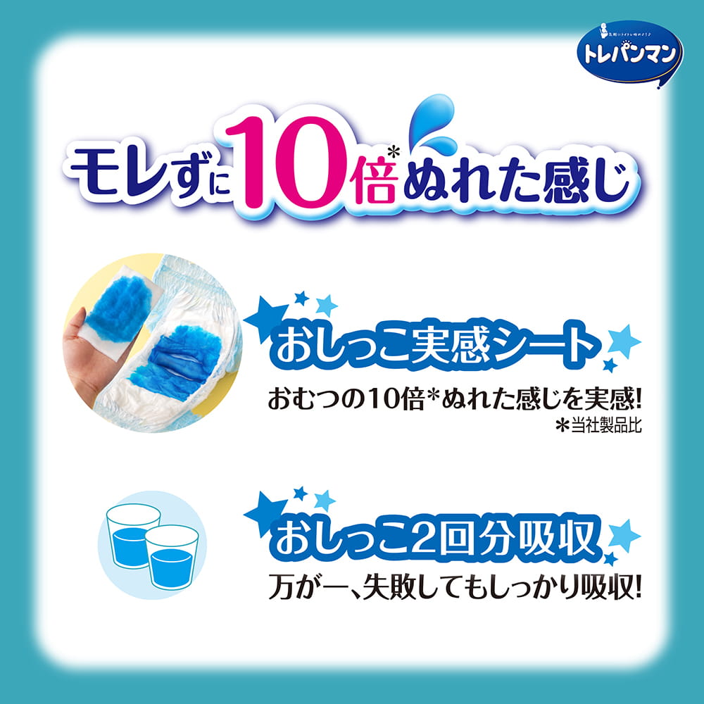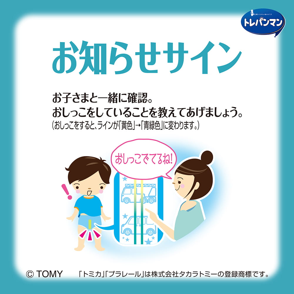 モレずに10倍*ぬれた感じ・おしっこ実感シート ・おしっこ2回分吸収 *当社製品比 | まるめるテープお子さまが喜ぶ20種類のかわいいデザイン。 ●デザインが実際の商品と異なる場合があります。 | お知らせサインお子さまと一緒に確認。 |