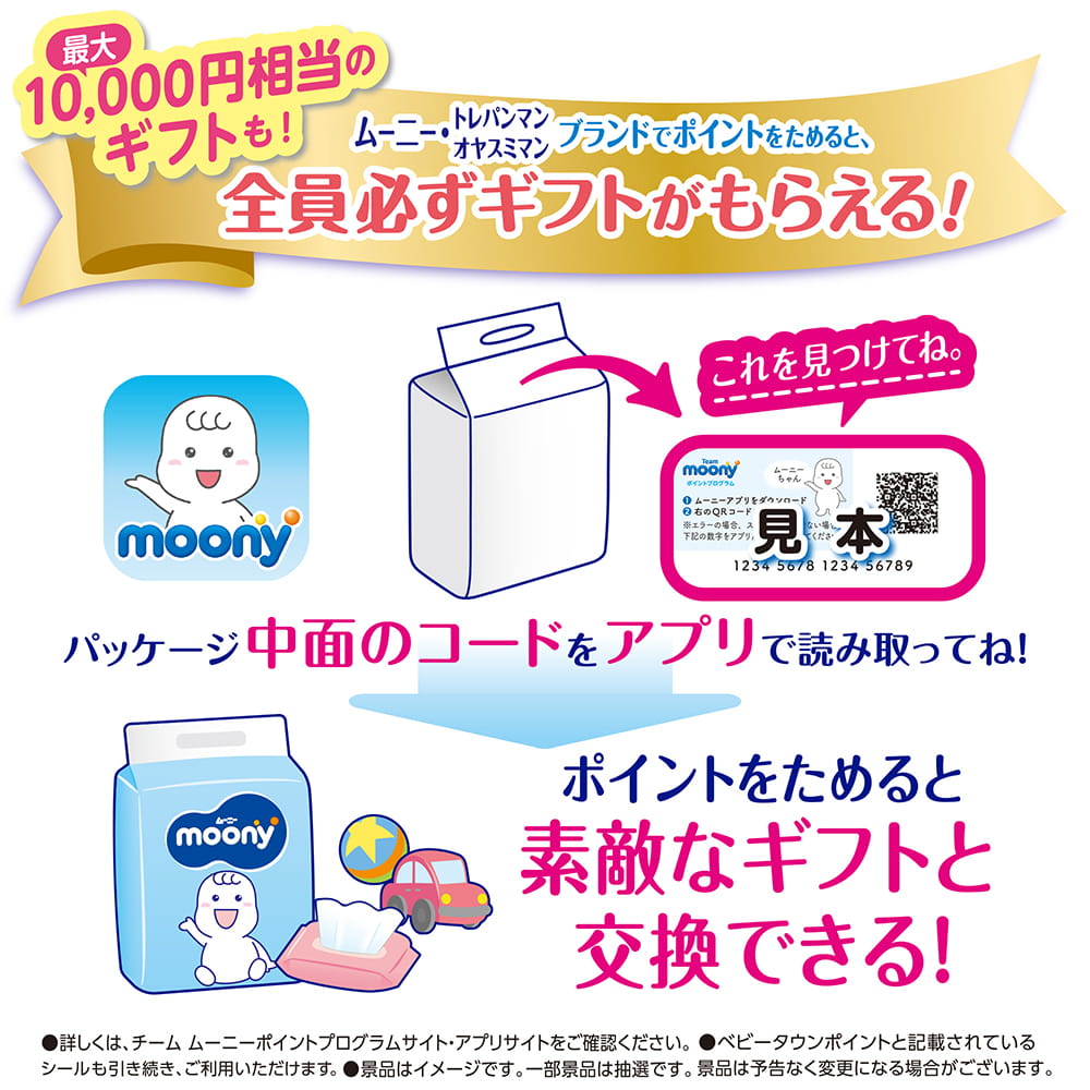 デザイン#は全部で10種類1袋に2種類入っています。(#デザインがかわりました) | 最大10,000円相当のギフトも!ムーニー・トレパンマン オヤスミマンブランドでポイントをためると、全員必ずギフトがもらえる! ●詳しくは、チーム ムーニーポイントプログラムサイト・アプリサイトをご確認ください。●ベビータウンポイントと記載されているシールも引き続き、ご利用いただけます。 |