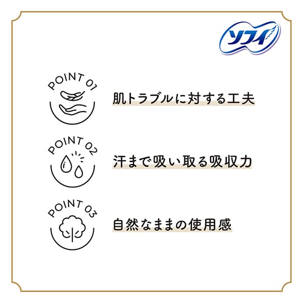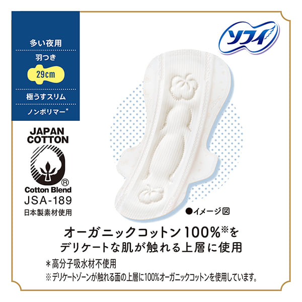 ![]() 女性にとって大切な生理期間を少しでも快適に過ごしてほしい。そんな想いから誕生した、生理用品シリーズです。 ※デリケートゾーンが触れる面の上層に100%オーガニックコットンを使用しています。 | ![]() 多い夜用 *高分子吸水材不使用 | ![]() [POINT 01]肌トラブルに対する工夫 [POINT 02]汗まで吸い取る吸収力 [POINT 03]自然なままの使用感 |