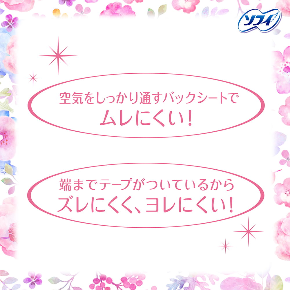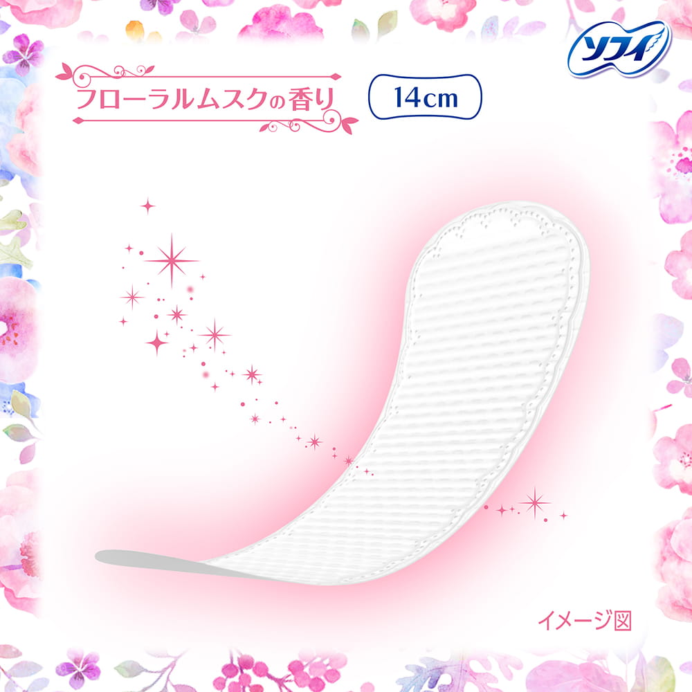ソフィはだおもいライナー フローラルムスク フローラルムスクの香り | ふわふわでかぶれにくいpoint.1 なめらかでやさしい肌ざわり point.2 ずっとサラサラをキープ! *おりものでかぶれやすい状態になった肌の事です。 | ムレにくい!ズレにくく、ヨレにくい! 空気をしっかり通すバックシートで、ムレにくい! |