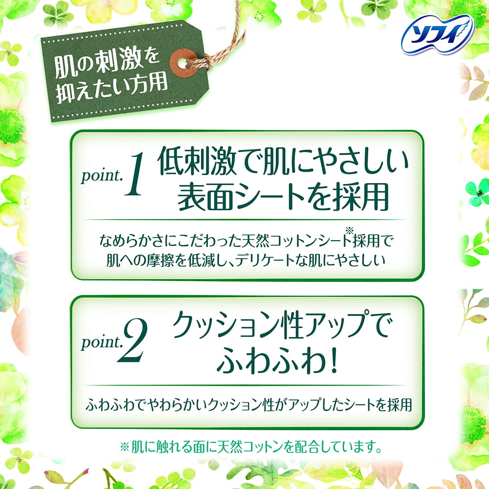 ソフィはだおもいライナー 天然極コットン※ 低刺激デリケートタイプ ※肌に触れる面に天然コットンを配合しています。 | 肌の刺激を抑えたい方用 point.1 低刺激で肌にやさしい表面シートを採用 point.2 クッション性アップでふわふわ! ※肌に触れる面に天然コットンを配合しています。 | ムレにくい!ズレにくく、ヨレにくい! 空気をしっかり通すバックシートで、ムレにくい! |