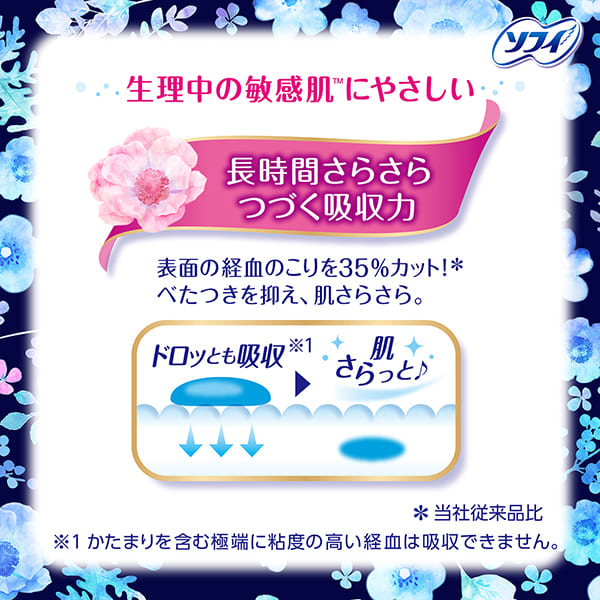 特に多い夜用・特に多い夜用 | 生理中の敏感肌にやさしい・長時間さらさらつづく吸収力 *当社従来品比 | ふんわりやさしい肌ざわり・ふんわりやさしい肌ざわり ・おしりを包み込み、モレをガード! *当社従来品比 |