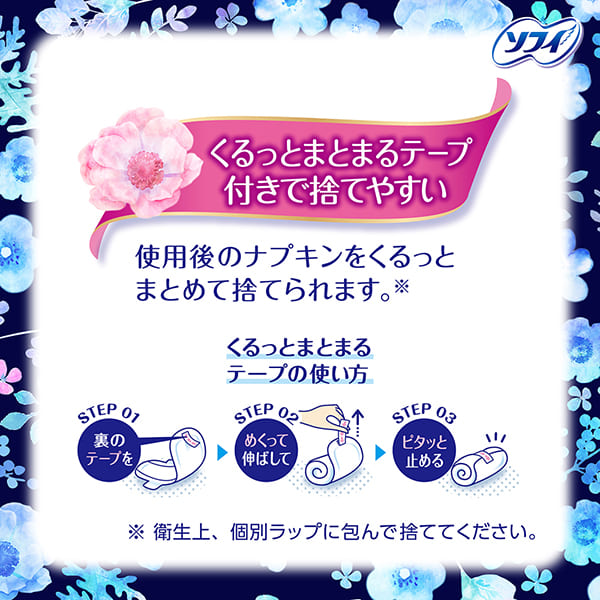くるっとまとまるテープ付きで捨てやすい使用後のナプキンをくるっとまとめて捨てられます。※ ※衛生上、個別ラップに包んで捨ててください。 | ソフィ はだおもい(R)シリーズ・ふんわりタイプ |