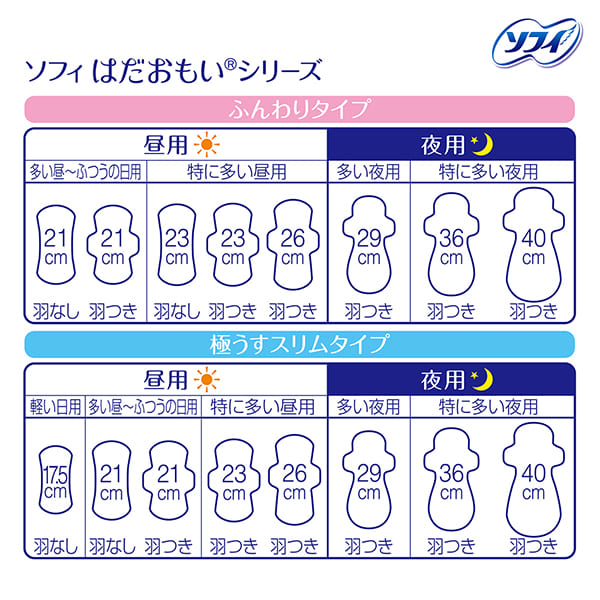 夜はもちろん昼間も量が多く漏れの心配もなく愛用しています。極薄は名の通りパンツファッションでも気にならず安心。バッグの中で場所をとらず気に入ってます。ショーツ型ナプキンも愛用。母もユニチャーム派でした。