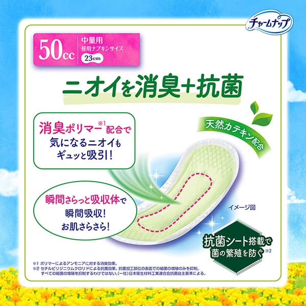 スリムなつけ心地で ギュッと吸引スリムなつけ心地で 水分 ニオイ ギュッと吸引 | ニオイを消臭+抗菌50cc 消臭ポリマー※1配合で気になるニオイもギュッと吸引! 天然カテキン配合 ※1 ポリマーによるアンモニアに対する消臭効果。 | モレ不安とさよならしようモレ不安とさよならしよう |