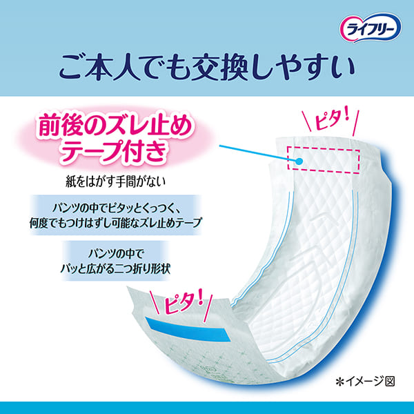 ![]() ごわごわ感が少ない「しなやかフィット設計」 横モレを防ぐ立体ギャザー ※吸収体縦方向に延びる一対のスリットにつながるくの字エンボス、 | ![]() 前後のズレ止めテープ付き パンツの中でピタッとくっつく、何度でもつけはずし可能なズレ止めテープ | ![]() おしっこ2回分:うす型・昼用 ※パッケージは予告なく変更することがあります |