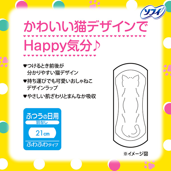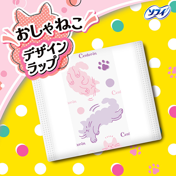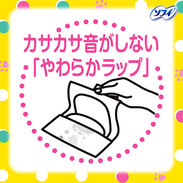 ![]() ●つけるとき前後が分かりやすい猫デザイン | ![]() おしゃねこデザインラップ | ![]() カサカサ音がしない「やわらかラップ」 |