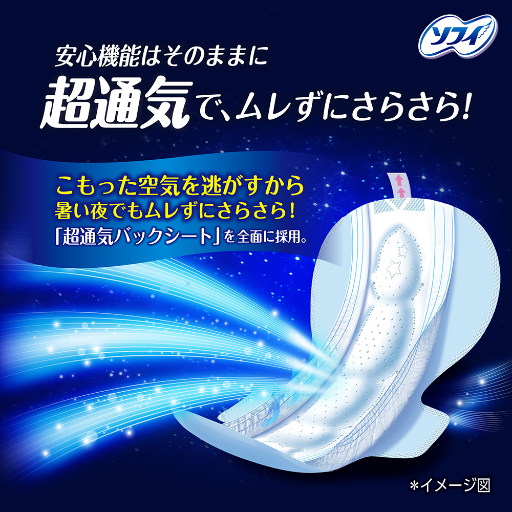 涼肌 ムレずにさらさら!・特に多い夜用 | 安心機能はそのままに超通気で、ムレずにさらさら!こもった空気を逃がすから暑い夜でもムレずにさらさら! | 一晩中モレ安心せき止め構造で横・うしろの流れモレガード |