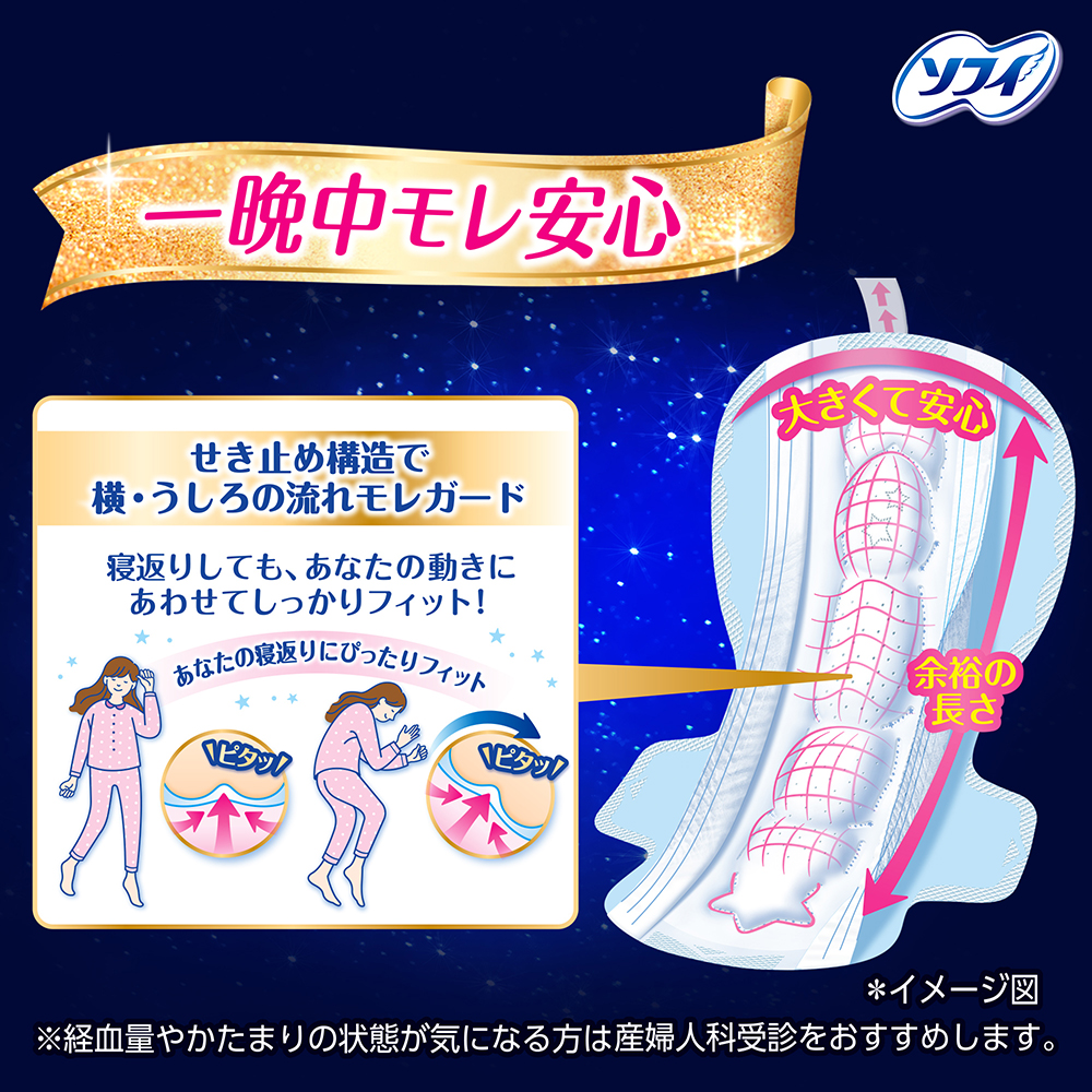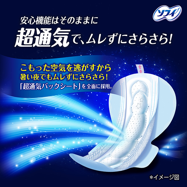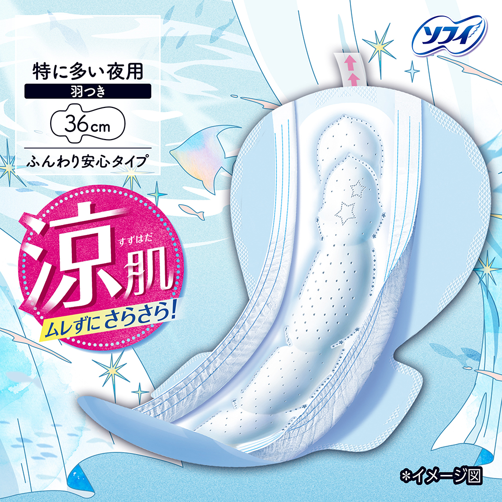 涼肌 ムレずにさらさら!・特に多い夜用 | 安心機能はそのままに超通気で、ムレずにさらさら!こもった空気を逃がすから暑い夜でもムレずにさらさら! | 一晩中モレ安心せき止め構造で横・うしろの流れモレガード |