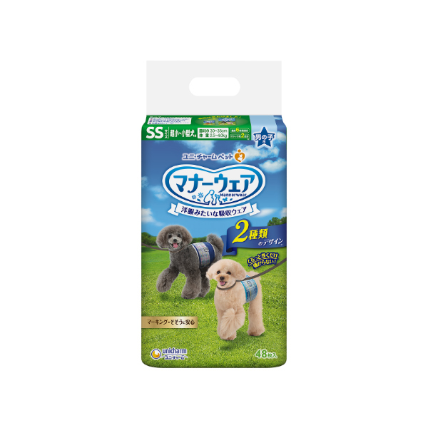 くるっと巻くだけスリムフィット形状 「くるっと巻くだけスリムフィット形状」で簡単装着、やさしくフィットして、元気に動き回る男の子のワンちゃんでも動きやすく嫌がりません。 | マーキング・そそうに安心 「マナーウェア男の子用」は、お出かけやお散歩時のマーキングやそそうに安心です。 旅行やドライブなど長時間の外出にもモレ安心の吸収設計です。 お部屋にいるとき、お留守番のときに使用することもできます。 | 使用時間と性別で愛犬に合ったマナーウェアを 使用時間と性別で愛犬に合ったマナーウェアが選べます。 ※1 ワンちゃんの6時間の平均オシッコ量を参考(ワンちゃんのオシッコ量には個体差があります) ※2 ワンちゃんの12時間の平均オシッコ量を参考(ワンちゃんのオシッコ量には個体差があります) |