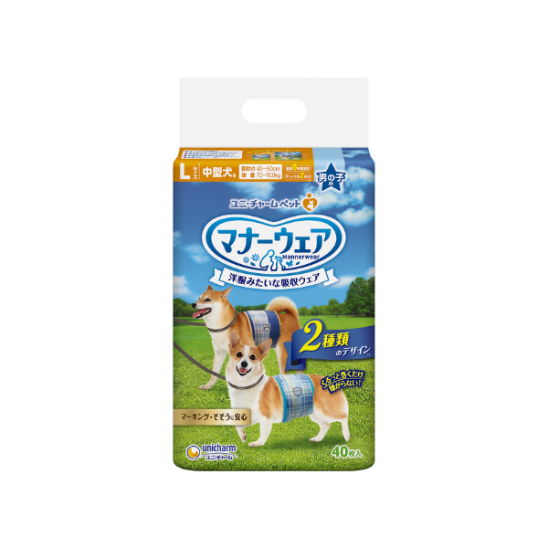 くるっと巻くだけスリムフィット形状 「くるっと巻くだけスリムフィット形状」で簡単装着、やさしくフィットして、元気に動き回る男の子のワンちゃんでも動きやすく嫌がりません。 | マーキング・そそうに安心 「マナーウェア男の子用」は、お出かけやお散歩時のマーキングやそそうに安心です。 旅行やドライブなど長時間の外出にもモレ安心の吸収設計です。 お部屋にいるとき、お留守番のときに使用することもできます。 | 使用時間と性別で愛犬に合ったマナーウェアを 使用時間と性別で愛犬に合ったマナーウェアが選べます。 ※1 ワンちゃんの6時間の平均オシッコ量を参考(ワンちゃんのオシッコ量には個体差があります) ※2 ワンちゃんの12時間の平均オシッコ量を参考(ワンちゃんのオシッコ量には個体差があります) |
