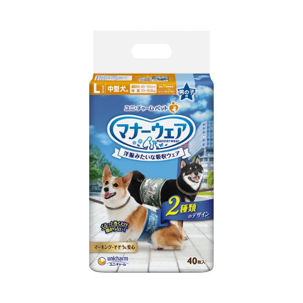 くるっと巻くだけスリムフィット形状                「くるっと巻くだけスリムフィット形状」で簡単装着、やさしくフィットして、元気に動き回る男の子のワンちゃんでも動きやすく嫌がりません。  |               マーキング・そそうに安心                「マナーウェア男の子用」は、お出かけやお散歩時のマーキングやそそうに安心です。 旅行やドライブなど長時間の外出にもモレ安心の吸収設計です。 お部屋にいるとき、お留守番のときに使用することもできます。  |               使用時間と性別で愛犬に合ったマナーウェアを                                    使用時間と性別で愛犬に合ったマナーウェアが選べます。 ※1 ワンちゃんの6時間の平均オシッコ量を参考(ワンちゃんのオシッコ量には個体差があります) ※2 ワンちゃんの12時間の平均オシッコ量を参考(ワンちゃんのオシッコ量には個体差があります)  |
