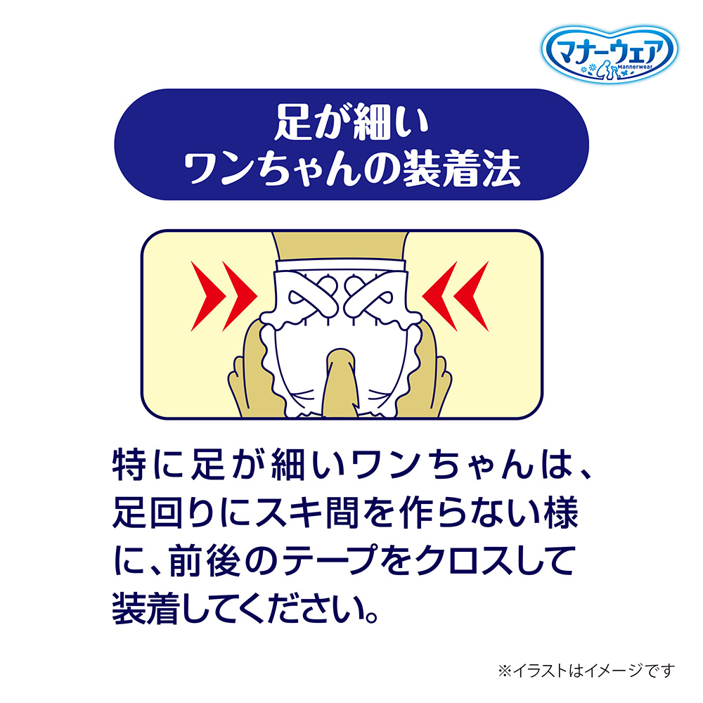 特に足が細いワンちゃんは、足回りにスキ間を作らない様に、前後のテープをクロスして装着してください。 |