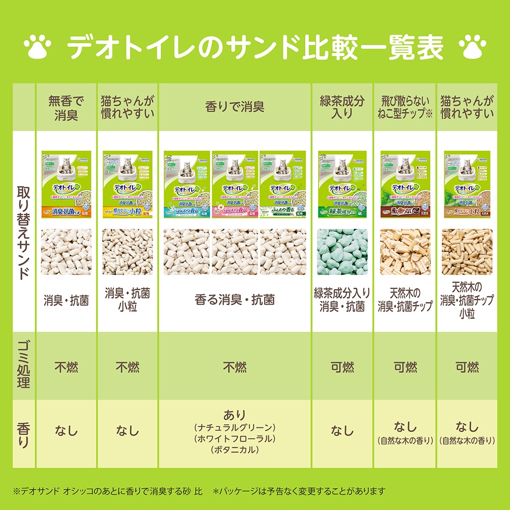 【!】本品の香りが猫ちゃんやお客様に合わない場合は、使用を中止してください。その際は、香り付きではない【デオトイレ専用取替サンド】へ変更いただくことをお勧めします。