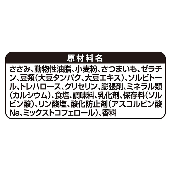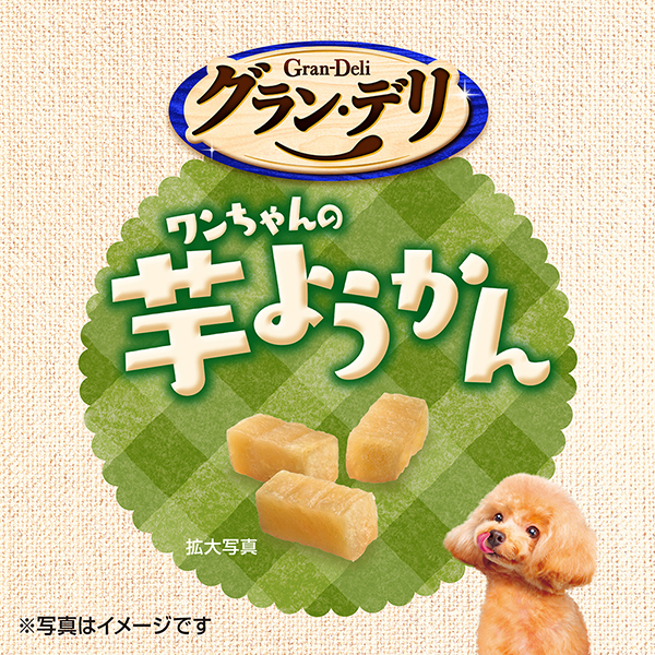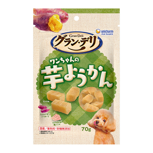 グラン・デリ ワンちゃんの芋ようかんグラン・デリ ワンちゃんの芋ようかん | しっとり食感の小さめで与えやすい芋ようかん100%国産*の鶏ささみとさつまいもを使用。 国産/着色料・砂糖無添加 | 原材料名 |