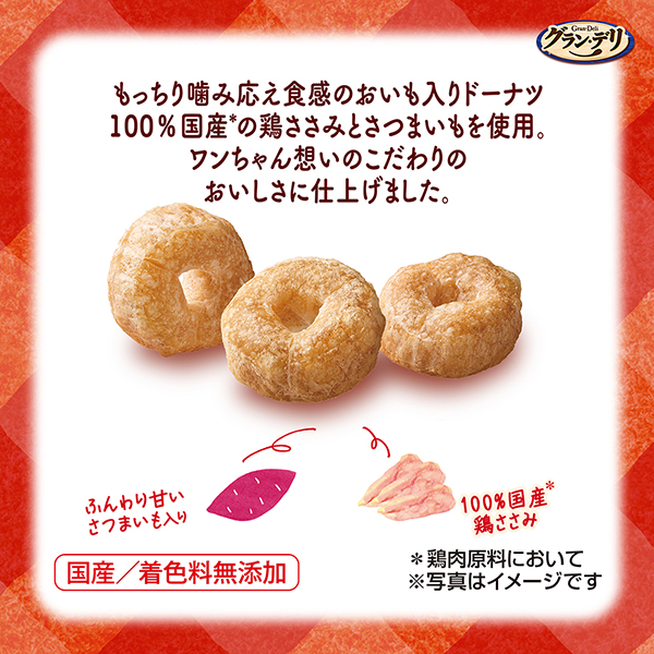 グラン・デリ ワンちゃんのおいも入りドーナツグラン・デリ ワンちゃんのおいも入りドーナツ | もっちり噛み応え食感のおいも入りドーナツ100%国産*の鶏ささみとさつまいもを使用。 国産/着色料無添加 | 原材料名 |