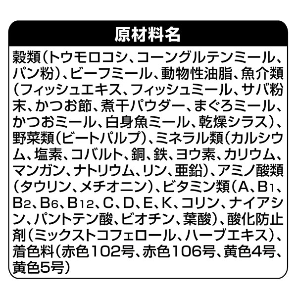 穀類(トウモロコシ、コーングルテンミール、パン粉)、ビーフミール、動物性油脂、魚介類(フィッシュエキス、フィッシュミール、サバ粉末、かつお節、煮干パウダー、まぐろミール、かつおミール、白身魚ミール、乾燥シラス)、野菜類(ビートパルプ)、ミネラル類(カルシウム、塩素、コバルト、銅、鉄、ヨウ素、カリウム、マンガン、ナトリウム、リン、亜鉛)、アミノ酸類(タウリン、メチオニン)、ビタミン類(A、B1、B2、B6、B12、C、D、E、K、コリン、ナイアシン、パントテン酸、ビオチン、葉酸)、酸化防止剤(ミックストコフェロール、ハーブエキス)、着色料(赤色102号、赤色106号、黄色4号、黄色5号)