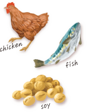 原材料によって含まれるアミノ酸量は異なります。厳選したチキン・魚・大豆由来の動物性と植物性のタンパク質を使用することで、バランスよくアミノ酸を摂ることができます。特に、大豆は豆乳から抽出した高純度の「分離大豆タンパク」を使用。