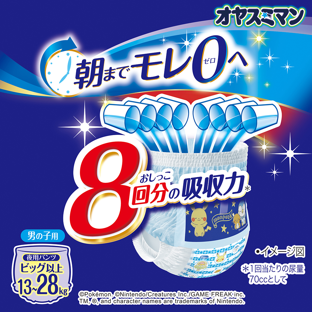超強力吸収で朝までモレ0へおしっこ8回分の吸収力*で一晩中モレ安心 | 360°モレ徹底ガード構造ギャザーをしっかりと立ててお使いください。 | ぐっすり夢ごこちデザインお子さまのはきたい気持ちを応援する |
