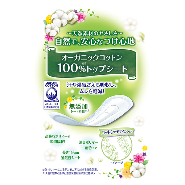 オーガニックコットン100%※1 トップシート ※1 肌が触れる面の上層に100%オーガニックコットンを使用しています。 |