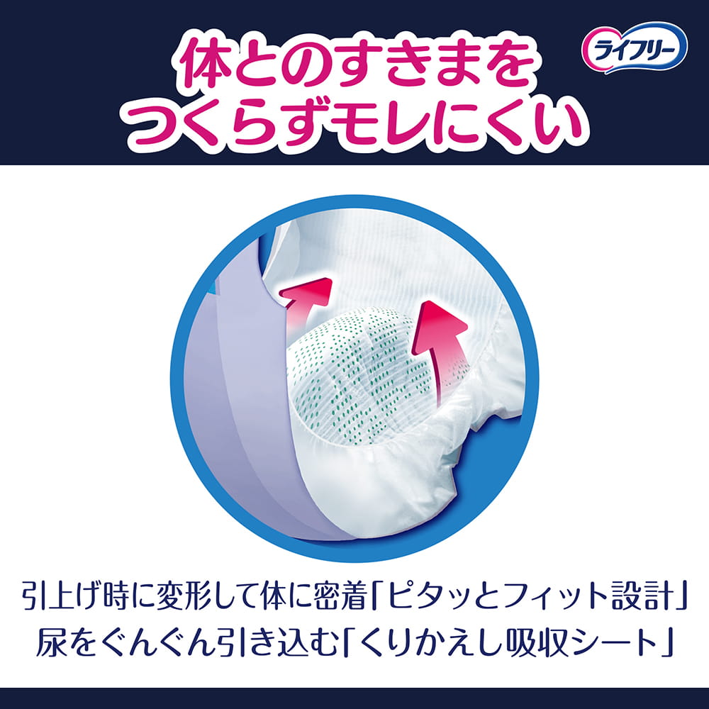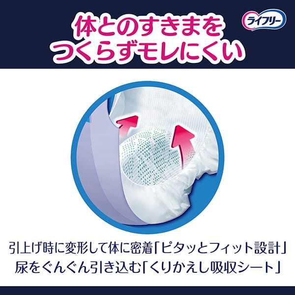 パンツの中でピタッとくっつく紙をはがす手間のない何度でもつけはずし出来るズレ止めテープ | 体とのすきまをつくらずモレにくい引き上げ時に変形して体に密着「ピタッとフィット設計」 | パンツの中でパッと広がる広げる手間がかからない二つ折り形状 長さ57cm「超ロング形状」 |