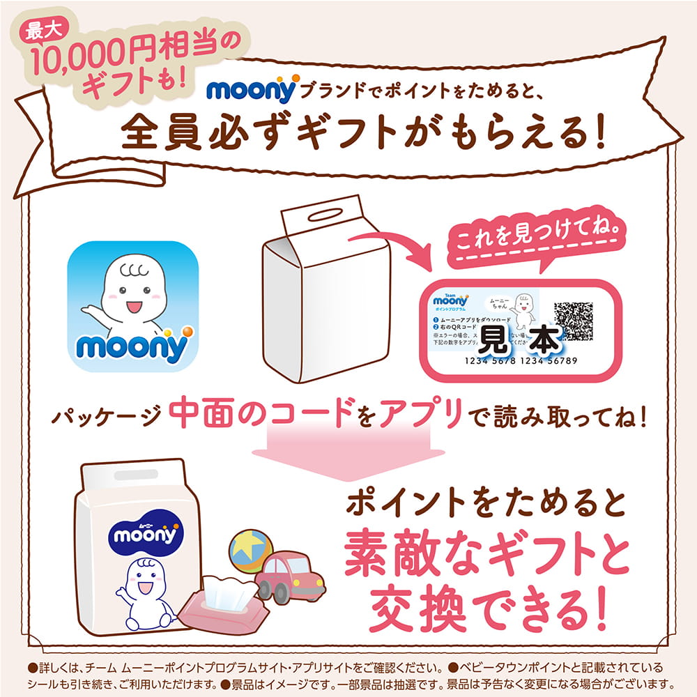 もっとあんしんなヒミツおしりを置く位置が分かりやすいから簡単装着!ズレずにモレ0へ | 成長に合わせて選べる ムーニー低刺激であんしん・テープ 赤ちゃんの体重など体型に合わせておむつのサイズを選ぶことをオススメします。 | moonyブランドでポイントをためると、全員必ずギフトがもらえる!最大10,000円相当のギフトも! |
