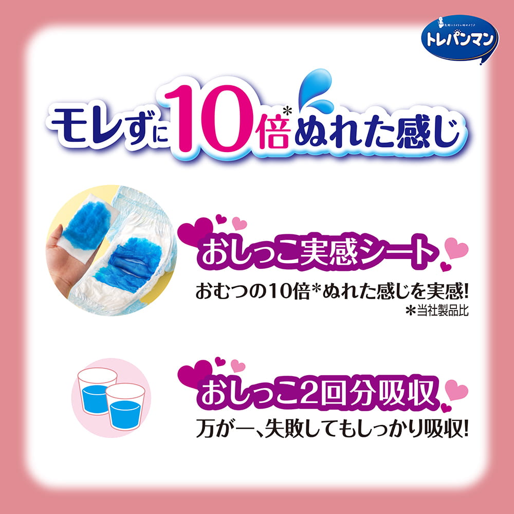 モレずに10倍*ぬれた感じ・おしっこ実感シート ・おしっこ2回分吸収 *当社製品比 | まるめるテープお子さまが喜ぶ20種類のかわいいデザイン。 ●デザインが実際の商品と異なる場合があります。 | お知らせサインお子さまと一緒に確認。 |