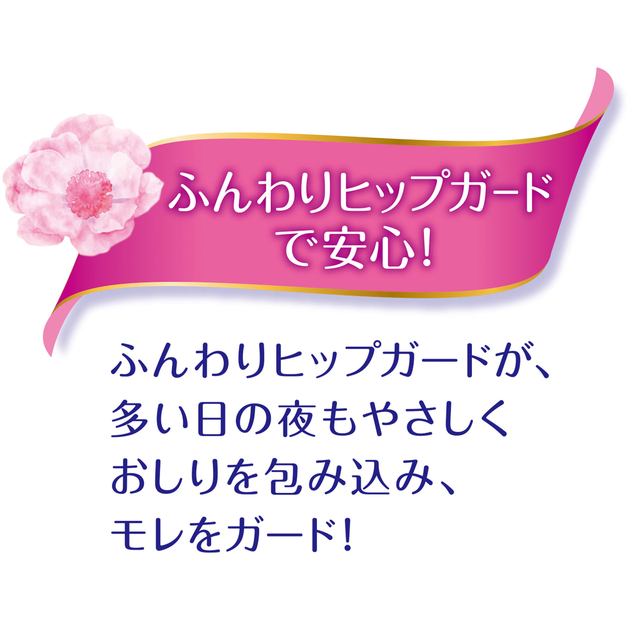ふんわりヒップガードが、多い日の夜もやさしくおしりを包み込み、モレをガード! |