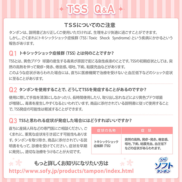 吸収量と製品タイプの選び方(一社)日本衛生材料工業連合会基準に基づく表示 ライト:量が少なめ 軽い日に | TSSについてのご注意タンポンは説明書どおり正しくご使用いただければ、生理をより快適に過ごすことができます。しかし、ごくまれにトキシックショック症候群(TSS:Toxic Shock Syndrome)という疾病にかかるという報告があります。 |