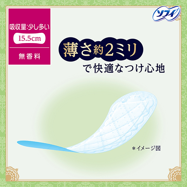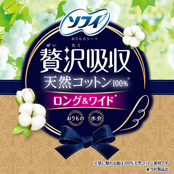 おりものシート 贅沢吸収 天然コットン100%※ ※肌に触れる面は100%天然コットン素材です | 薄さ約2ミリで快適なつけ心地 吸収量:少し多い | おりもの・水分を贅沢に吸収! 天然コットン100%※1素材を贅沢に使用! 3倍※3吸収シート デオドラント※2 ※1肌に触れる面は100%天然コットン素材です |