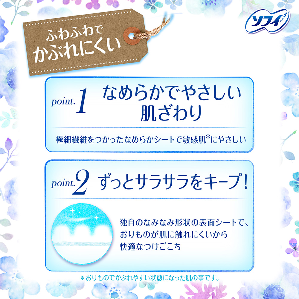 ソフィはだおもいライナー 無香料無香料 | ふわふわでかぶれにくいpoint.1 なめらかでやさしい肌ざわり point.2 ずっとサラサラをキープ! *おりものでかぶれやすい状態になった肌の事です。 | ムレにくい!ズレにくく、ヨレにくい!空気をしっかり通すバックシートで、ムレにくい! |