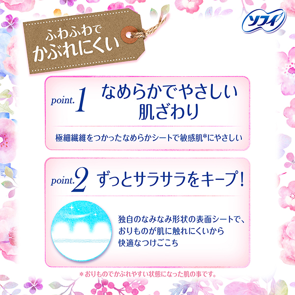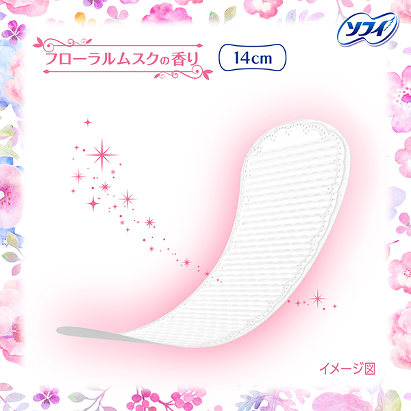 ソフィはだおもいライナー フローラルムスク フローラルムスクの香り | ふわふわでかぶれにくいpoint.1 なめらかでやさしい肌ざわり point.2 ずっとサラサラをキープ! *おりものでかぶれやすい状態になった肌の事です。 | ムレにくい!ズレにくく、ヨレにくい! 空気をしっかり通すバックシートで、ムレにくい! |