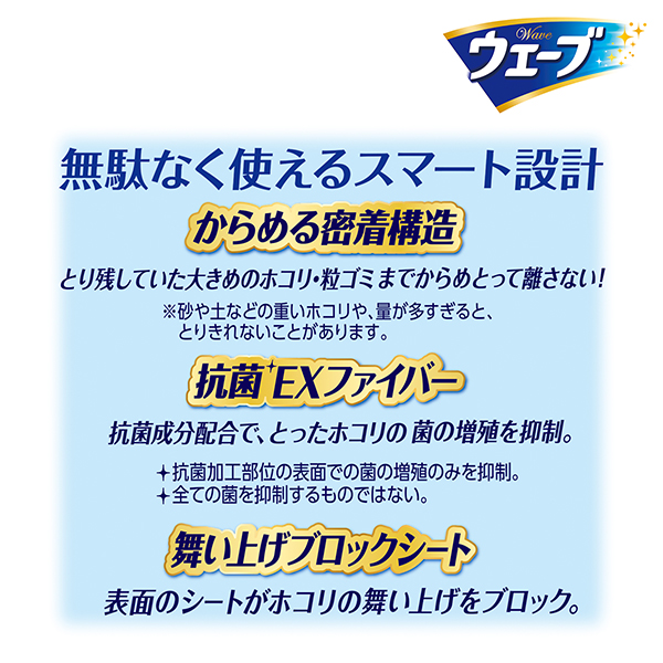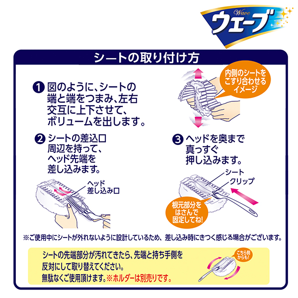 ![]() (1)シートの端と端をつまみ、左右交互に上下させて、ボリュームを出します。 | ![]() 次回からは別売りの「ウェーブ取り替えシート」をご利用ください。 |