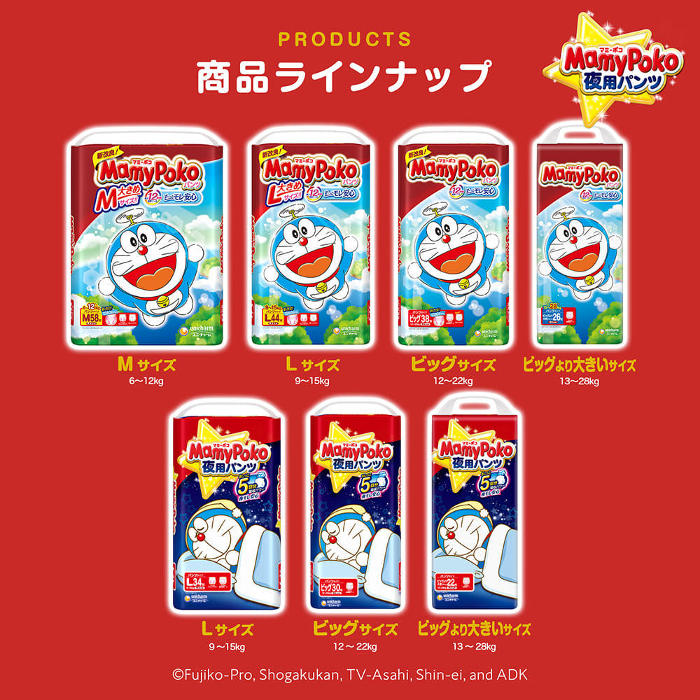 やわらか全面通気シート・やわらか全面通気シート ・ウエストは超ふわふわ! | 夜用ドラえもんデザイン夜用ドラえもんデザインで、毎晩のおむつ替えを楽しく♪ ※画像はイメージです。 | マミーポコパンツ ラインナップ【パンツ】 【夜用】 体重はおむつ選びの目安です。体型に合わせてサイズを選ぶことをオススメします。 |