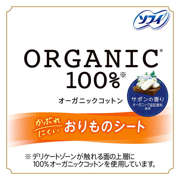 オーガニックコットン100%※ サボンの香り オーガニック認証香料使用※デリケートゾーンが触れる面の上層に100%オーガニックコットンを使用しています。 | かぶれにくいおりものシートオーガニックコットン100%※をデリケートな肌が触れる上層に使用。 | POINT[POINT 01]ムレにくく、かぶれにくい |