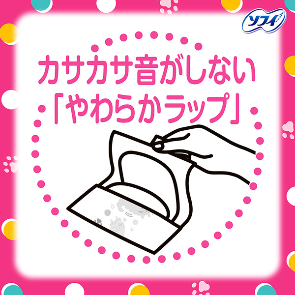 ![]() ●つけるとき前後が分かりやすい猫デザイン | ![]() おしゃねこデザインラップ | ![]() カサカサ音がしない「やわらかラップ」 |