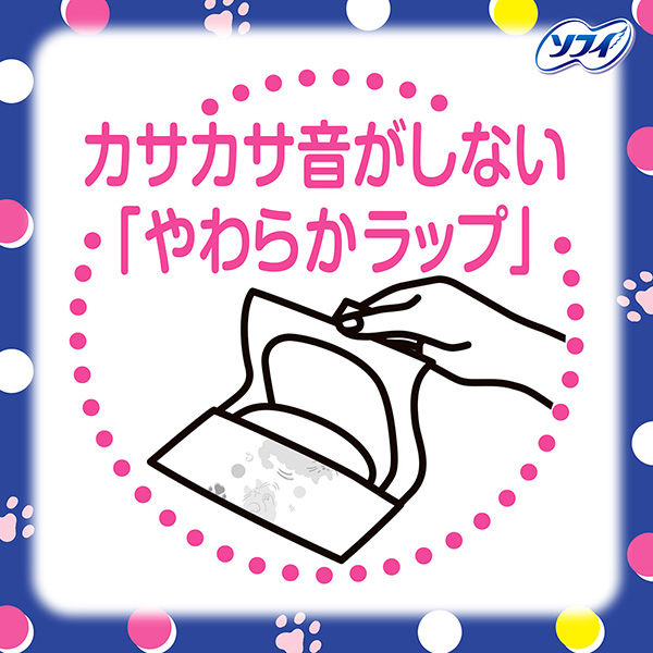 ![]() ●つけるとき前後が分かりやすい猫デザイン | ![]() おしゃねこデザインラップ | ![]() カサカサ音がしない「やわらかラップ」 |