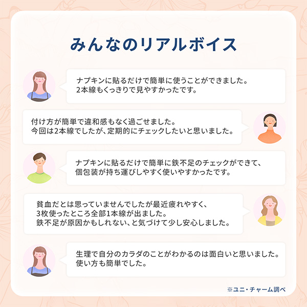 - 本製品は鉄欠乏性貧血を診断するものではありません。鉄不足は疲れの一因です。鉄欠乏性貧血と診断された場合は、引き続き医療機関に相談することを推奨いたします。鉄不足の可能性(1枚目でも1本線)ありの場合は、生活習慣の改善に加え、医療機関の受診をおすすめします。鉄不足の可能性が低い(すべて2本線)場合も、定期的なチェックをおすすめいたします。本製品は生理期間中に普段お使いのナプキンの上に貼ってお使いください。生理期間中に本製品をナプキンの代わりとして使うことはできません。お肌に合わないときは医師に相談してください。使用後はナプキンと一緒に個別ラップに包んですててください。