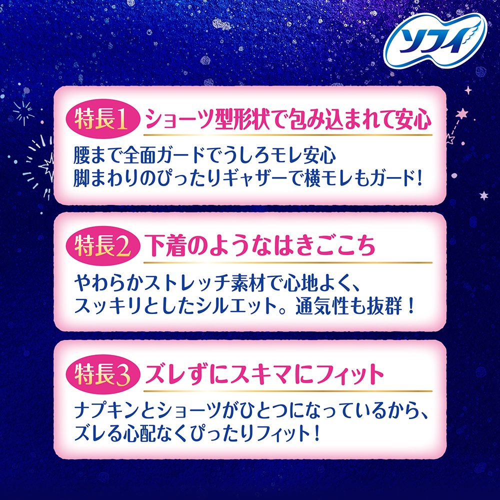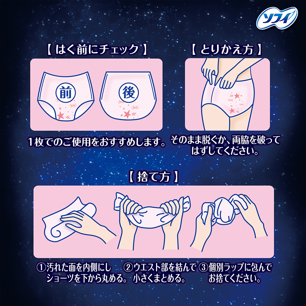 普通のナプキンだと夜寝てる時に寝返りうつことで漏れたりするのですが、パンツタイプなのでギャザーで漏れを防いでくれます。