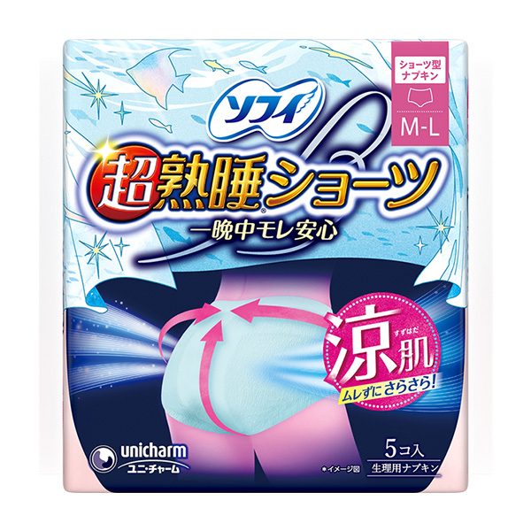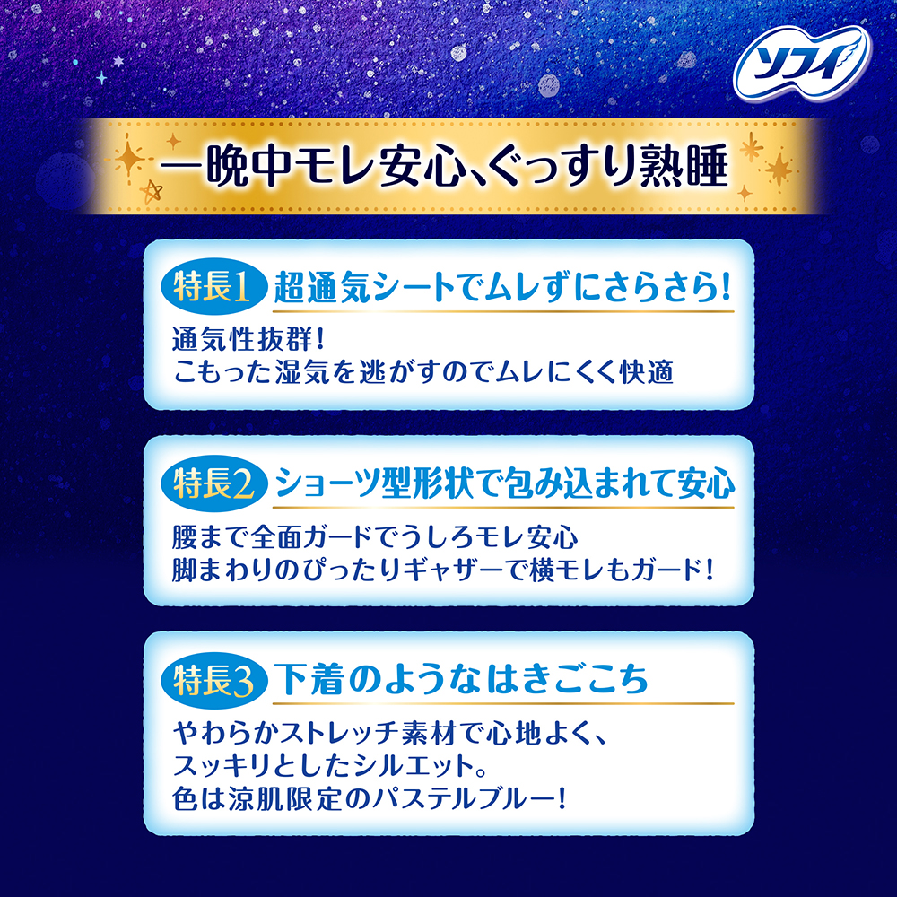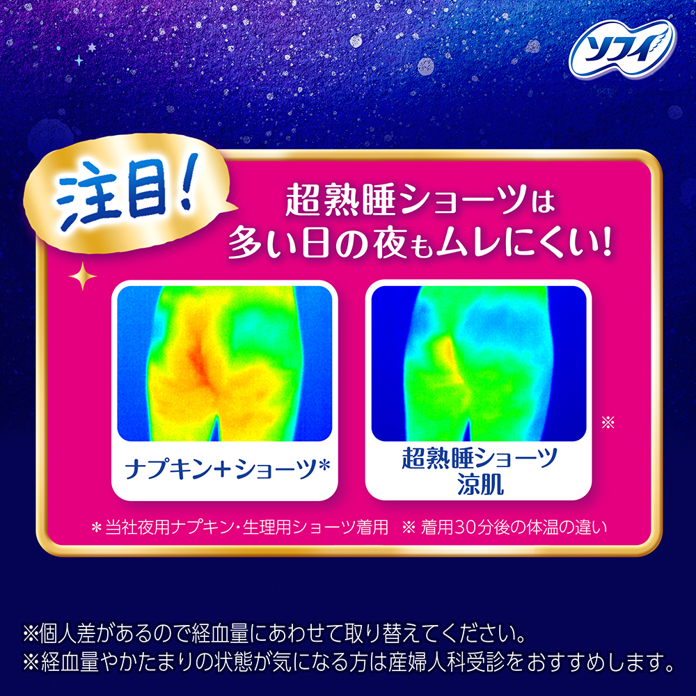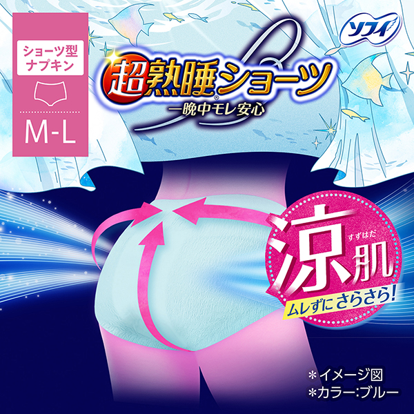 涼肌 ムレずにさらさら!・ショーツ型ナプキン | 一晩中モレ安心、ぐっすり熟睡特長1 超通気シートでムレずにさらさら! 特長2 ショーツ型形状で包み込まれて安心 特長3 下着のようなはきごこち | 注目!超熟睡ショーツは多い日の夜もムレにくい!超熟睡ショーツは多い日の夜もムレにくい! ※個人差があるので経血量にあわせて取り替えてください。 |