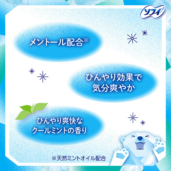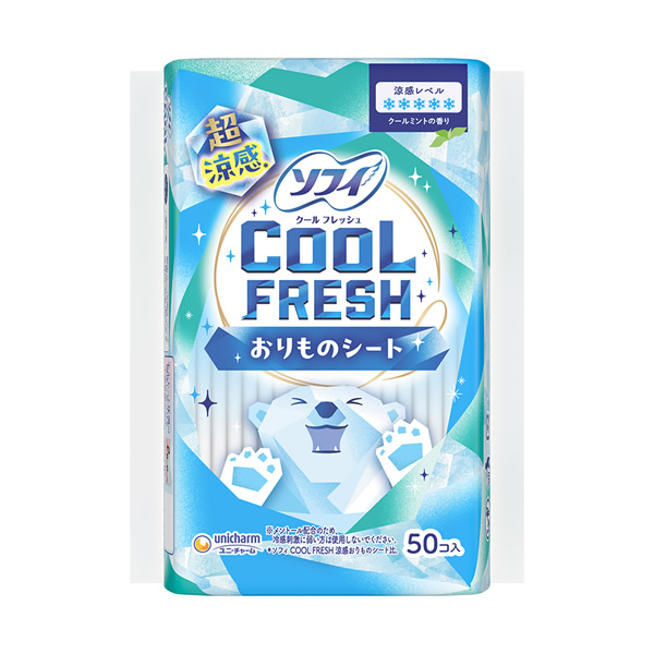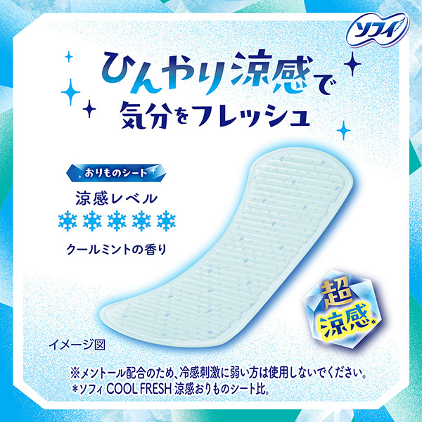 超涼感* ひんやり涼感で気分をフレッシュおりものシート | メントール配合※メントール配合※ | ソフィCOOLシリーズ・ナプキン(医薬部外品) |