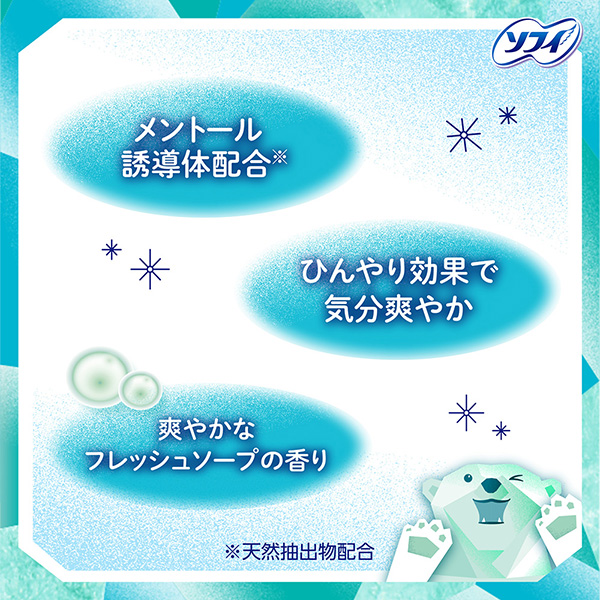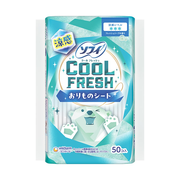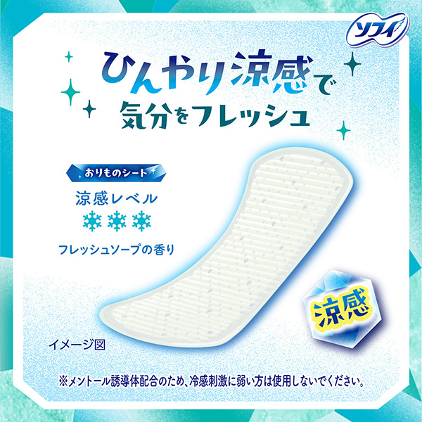 ひんやり涼感で気分をフレッシュおりものシート | メントール誘導体配合※メントール誘導体配合※ | ソフィCOOLシリーズ・ナプキン(医薬部外品) |