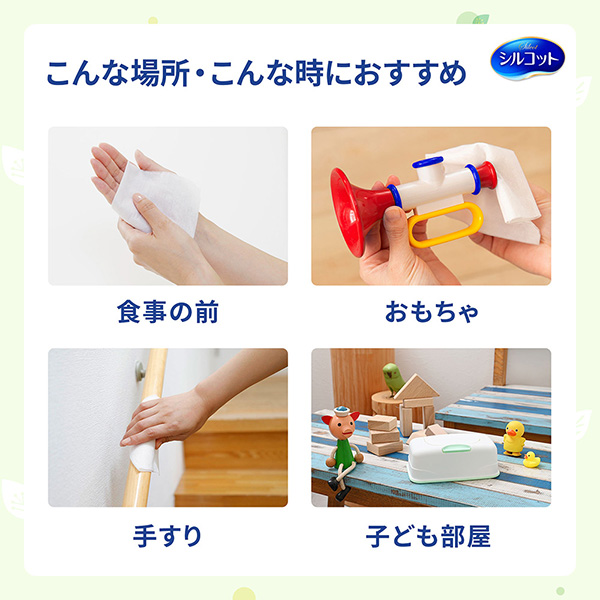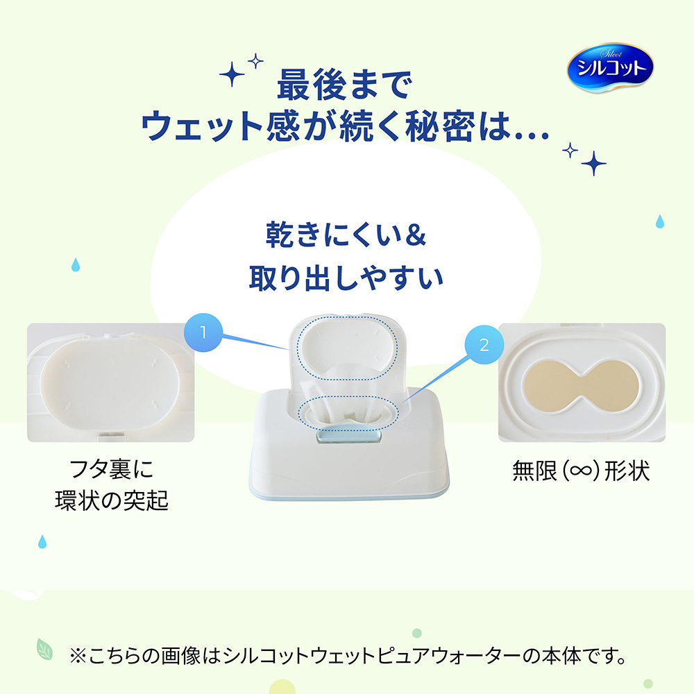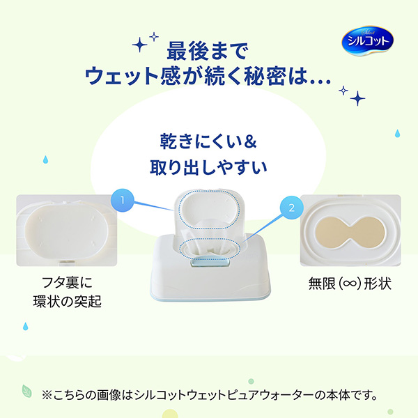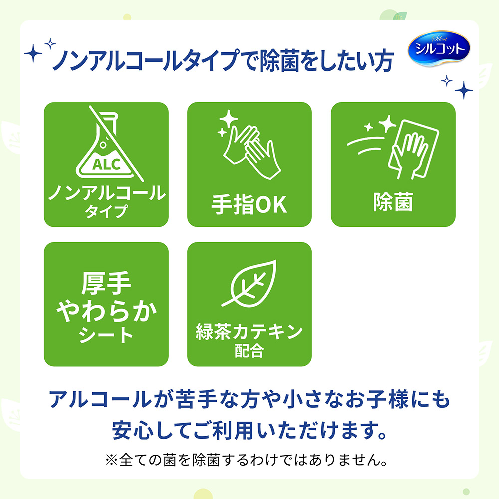 ノンアルコールでしっかり除菌乾いたふきんとノンアルコール除菌ウェットティッシュでは、拭き取った後の菌の状態がこんなに違います。 | 最後までウェット感が続く秘密は・・・乾きにくい&取り出しやすい | ノンアルコールタイプで除菌をしたい方アルコールが苦手な方や小さなお子様にも安心してご利用いただけます。 |
