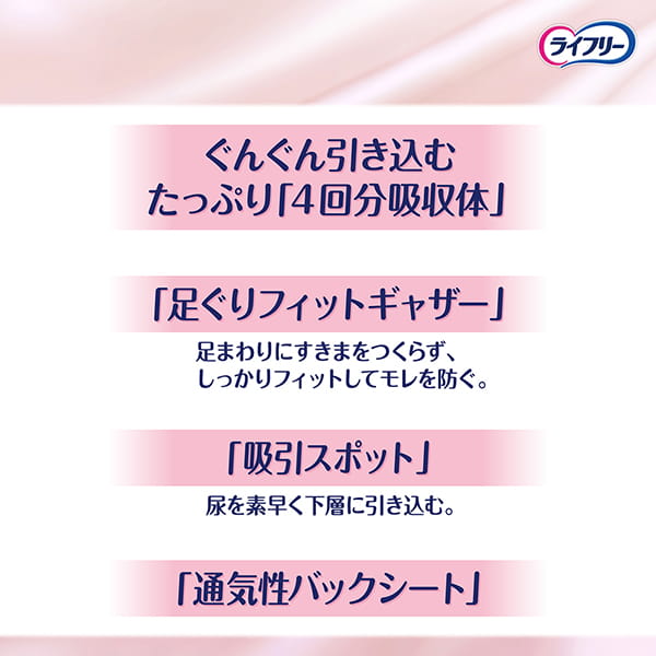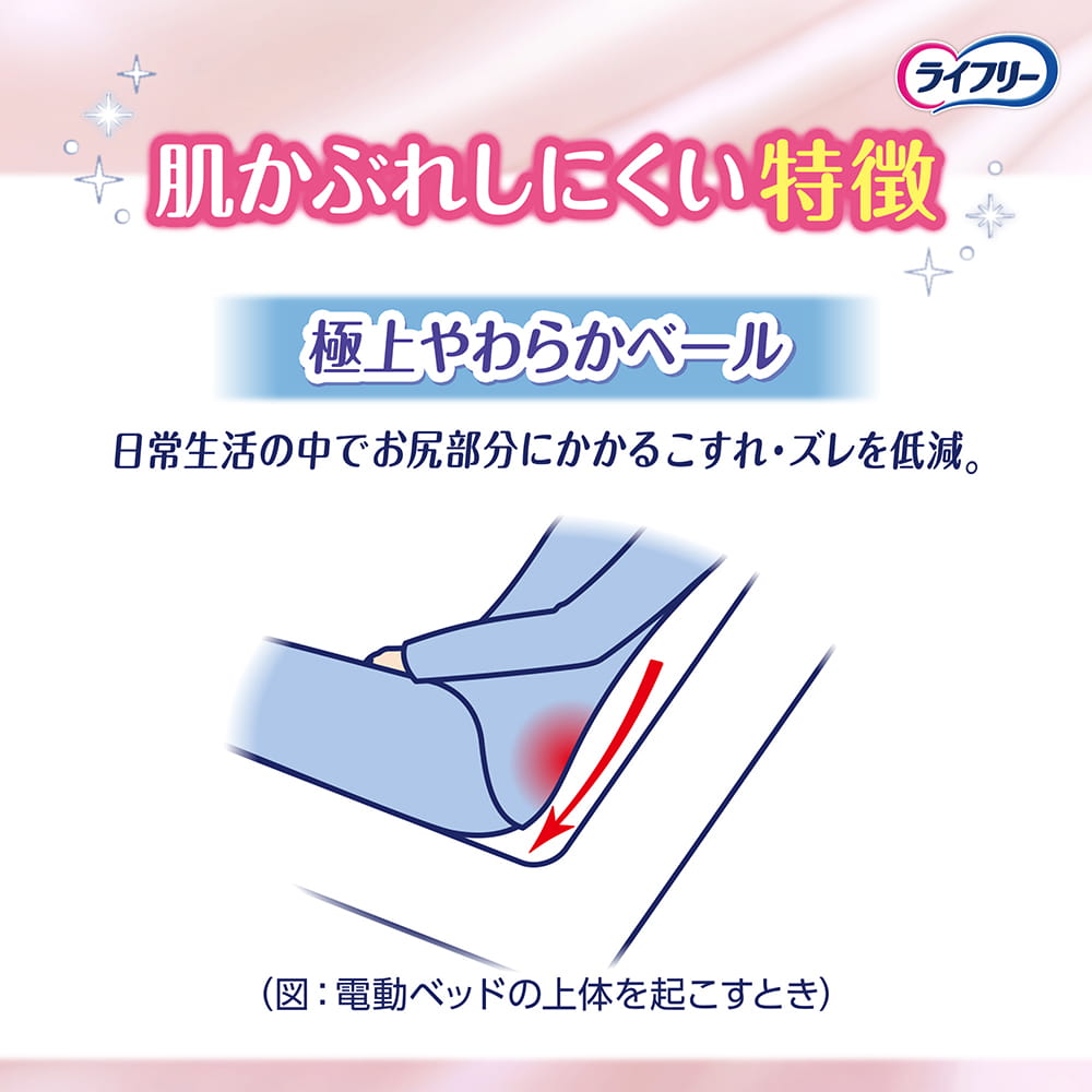 バリア機能が弱まった肌※にも 低刺激でやさしいから、1日中安心。お尻のこすれ低減 ※ムレや排泄物によってふやけた肌 | 肌かぶれしにくい特徴極上やわらかベール | ぐんぐん引き込む たっぷり「4回分吸収体」ぐんぐん引き込む たっぷり「4回分吸収体」 「足ぐりフィットギャザー」 「吸引スポット」 「通気性バックシート」 |
