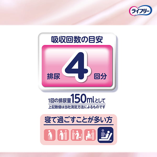 パワー消臭 トリプル効果※パワー消臭 トリプル効果※ お肌さらさら すきまモレ ゼロへ! ※アンモニア・ジメチルアミン・インドールについての消臭効果があります。 | 吸収回数の目安吸収回数の目安 排尿4回分 寝て過ごすことが多い方 |
