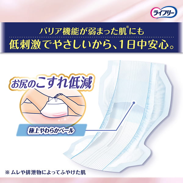 バリア機能が弱まった肌※にも 低刺激でやさしいから、1日中安心。お尻のこすれ低減 ※ムレや排泄物によってふやけた肌 | 肌かぶれしにくい特徴極上やわらかベール | ぐんぐん引き込む たっぷり「6回分吸収体」ぐんぐん引き込む たっぷり「6回分吸収体」 「足ぐりフィットギャザー」 「吸引スポット」 「通気性バックシート」 |
