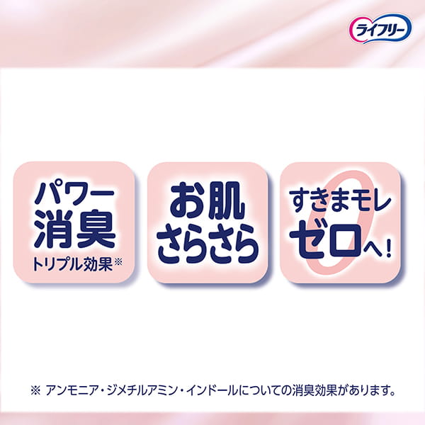パワー消臭 トリプル効果※パワー消臭 トリプル効果※ お肌さらさら すきまモレ ゼロへ! ※アンモニア・ジメチルアミン・インドールについての消臭効果があります。 | 吸収回数の目安吸収回数の目安 排尿6回分 寝て過ごすことが多い方 |