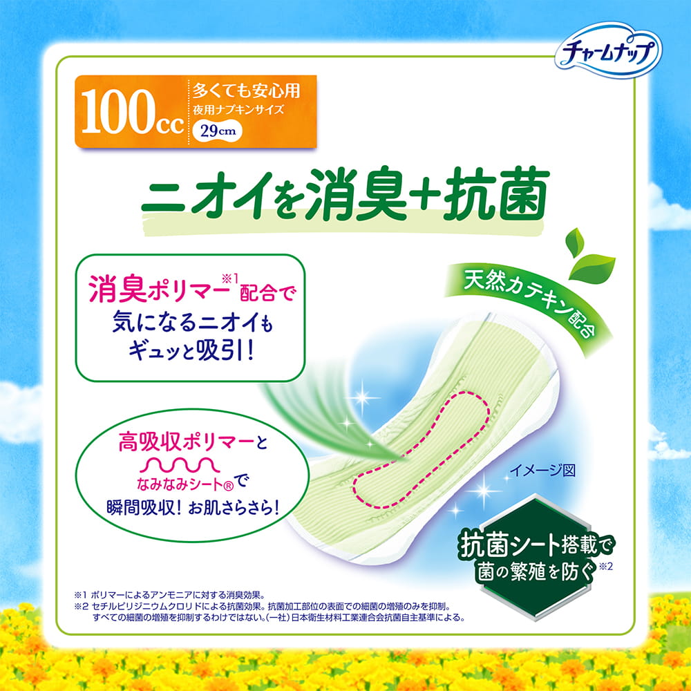 スリムなつけ心地で ギュッと吸引スリムなつけ心地で 水分 ニオイ ギュッと吸引 | ニオイを消臭+抗菌100cc・多くても安心用・夜用ナプキンサイズ・29cm 消臭ポリマー※1配合で気になるニオイもギュッと吸引! | モレ不安とさよならしようモレ不安とさよならしよう |