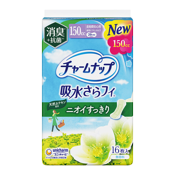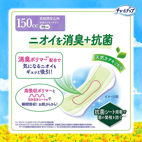 スリムなつけ心地で ギュッと吸引スリムなつけ心地で 水分 ニオイ ギュッと吸引 | ニオイを消臭+抗菌150cc・長時間安心用・夜用ナプキンサイズ・29cm 消臭ポリマー※1配合で気になるニオイもギュッと吸引! | モレ不安とさよならしようモレ不安とさよならしよう |