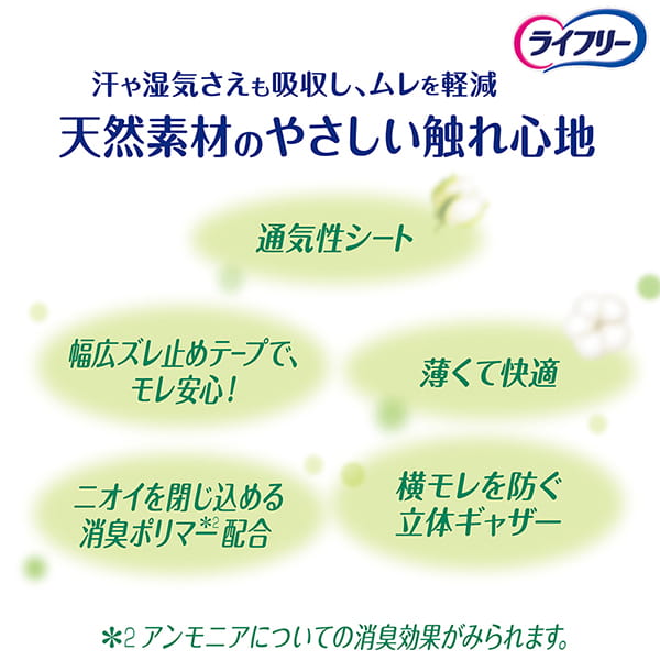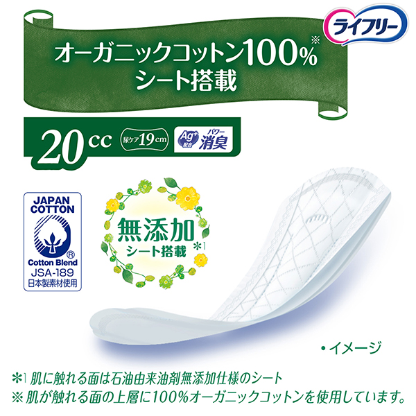 オーガニックコットン100%※シート搭載・20cc *1 肌に触れる面は石油由来油剤無添加仕様のシート | 汗や湿気さえも吸収し、ムレを軽減 天然素材のやさしい触れ心地・通気性シート *2 アンモニアについての消臭効果がみられます。 | 簡単スピード装着カサカサ音がしない「やわらかラップ」 ・生理用ナプキンではありません。 |